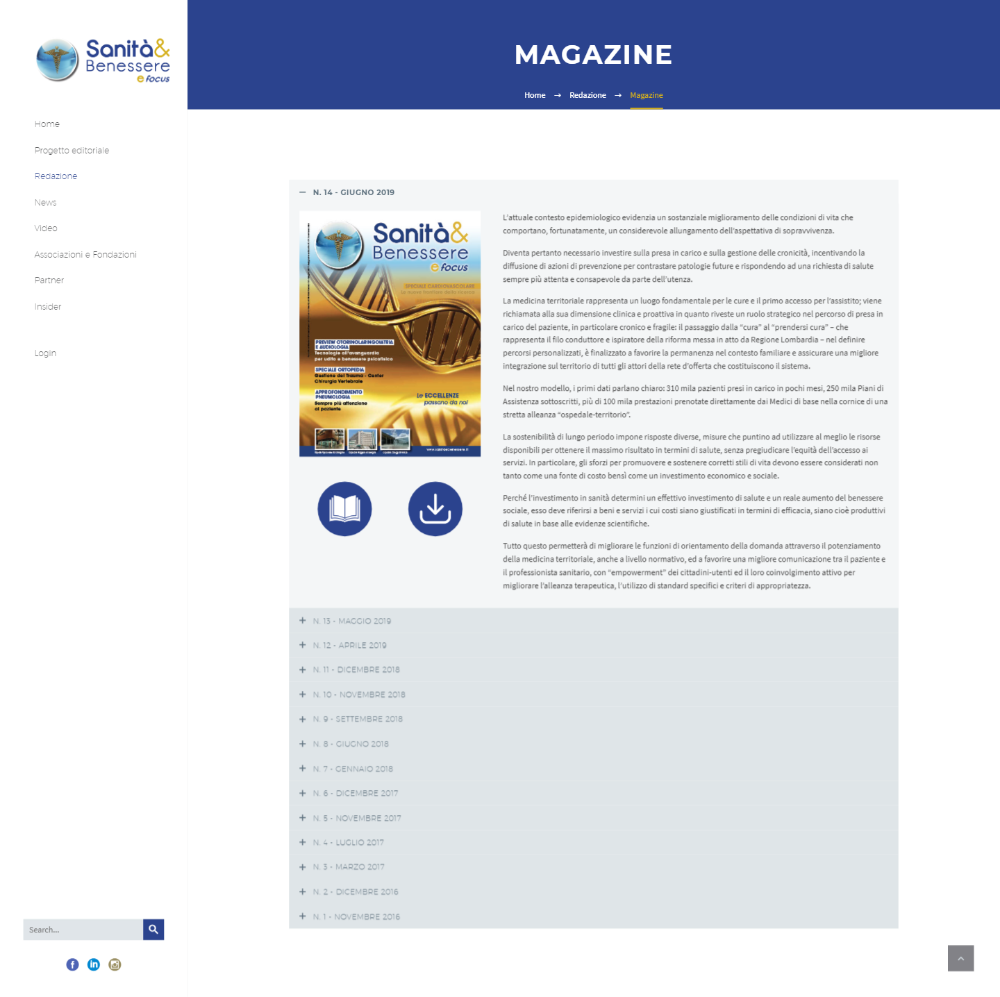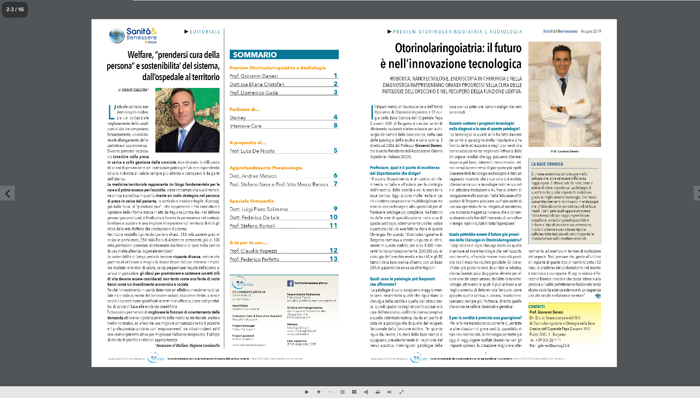 Sanità&Benessere efocus is a medical magazine, attached to Il Corriere della Sera in North Italy, and to La Repubblica in South Italy, with a circulation of 150.000 copies. On its website you can find not only all news and interviews, but also videos and special contents available only online.